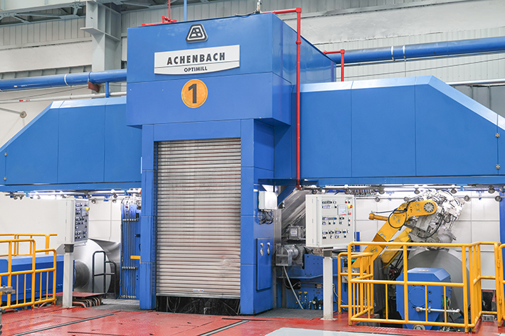 箔轧生产线:配备9条国际先进水平的铝箔生产线,引进3台1950mm阿申巴赫OPTIMILL®4辊不可逆铝箔轧机,可实现从坯料到8μm成品加工。轧机配备先进的VC轧辊凸度调整系统,德国高精度EMS测厚,及在线高速版型自动调节系统。生产最大速度达1500-2000米/分。配备6台国产涿神轧机,年产能约7.5万吨。