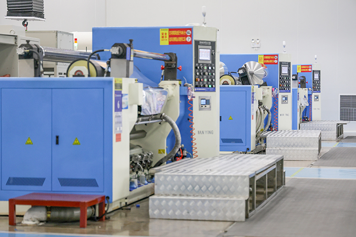 精切生产线:建造4500平方米的10万级无尘车间,内有高性能铝箔精切机47台。主机配备有微电脑智能控制系统,牵引及收卷部分使用西门子先进的伺服驱动系统,设备加装先进的等离子表面处理和电晕表面处理及吸尘装置、张力检测设备、CCD以及表面湿润张力检测仪器。在充分满足产品洁净要求下,生产速度最高达到300米/分。