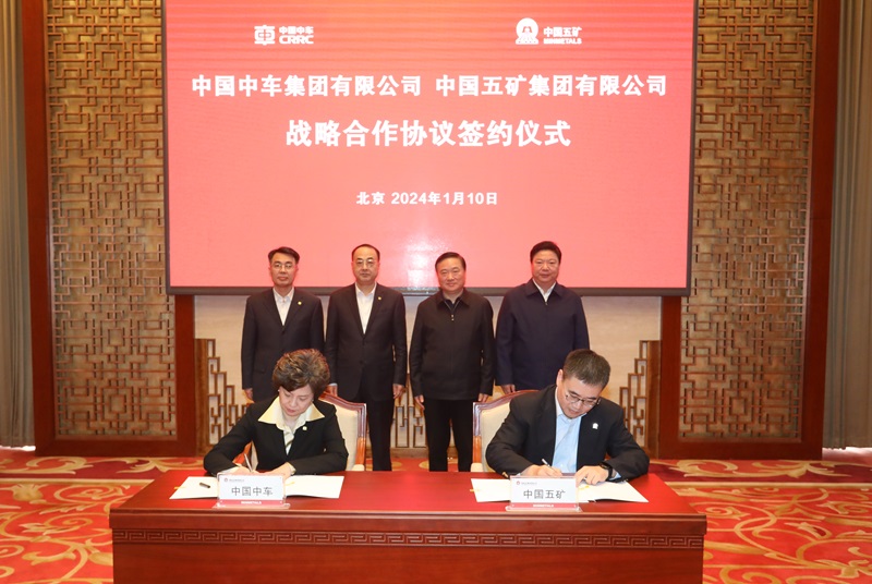 中国五矿与中国中车1月10日在京签署战略合作协议。中国五矿党组书记、董事长翁祖亮,总经理、党组副书记国文清与中国中车党委书记、董事长孙永才,党委副书记、执行董事王铵共同见证并举行会谈。