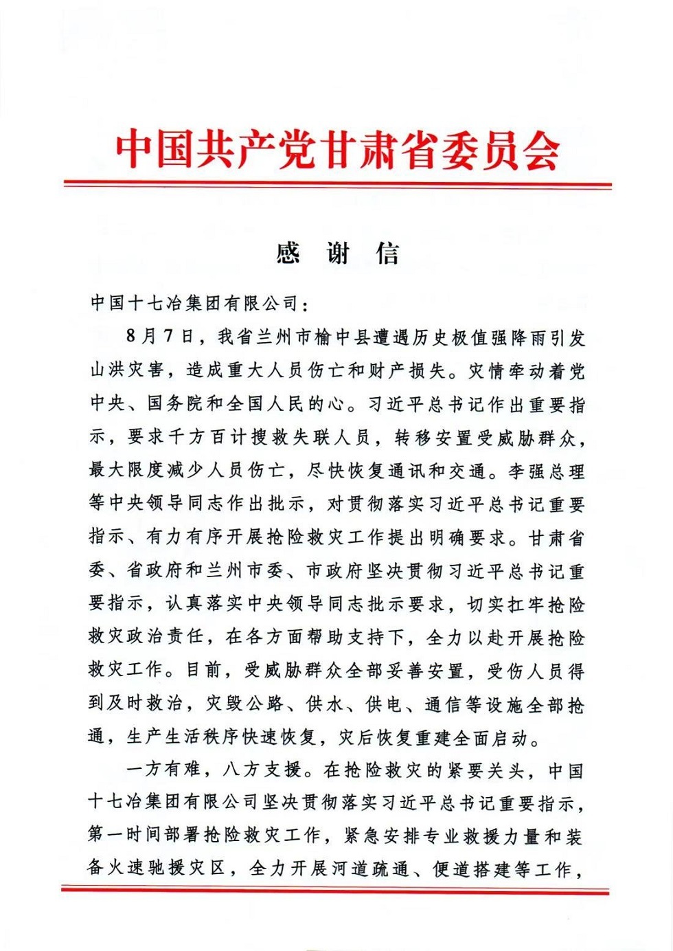 近日,中共甘肃省委和甘肃省人民政府向中国五矿所属中国十七冶致感谢信,对中国十七冶第一时间调集专业救援力量和装备火速驰援抢险救灾工作表达感谢和敬意,以及在关键时刻展现出的强烈政治担当和深厚为民情怀给予高度赞扬。