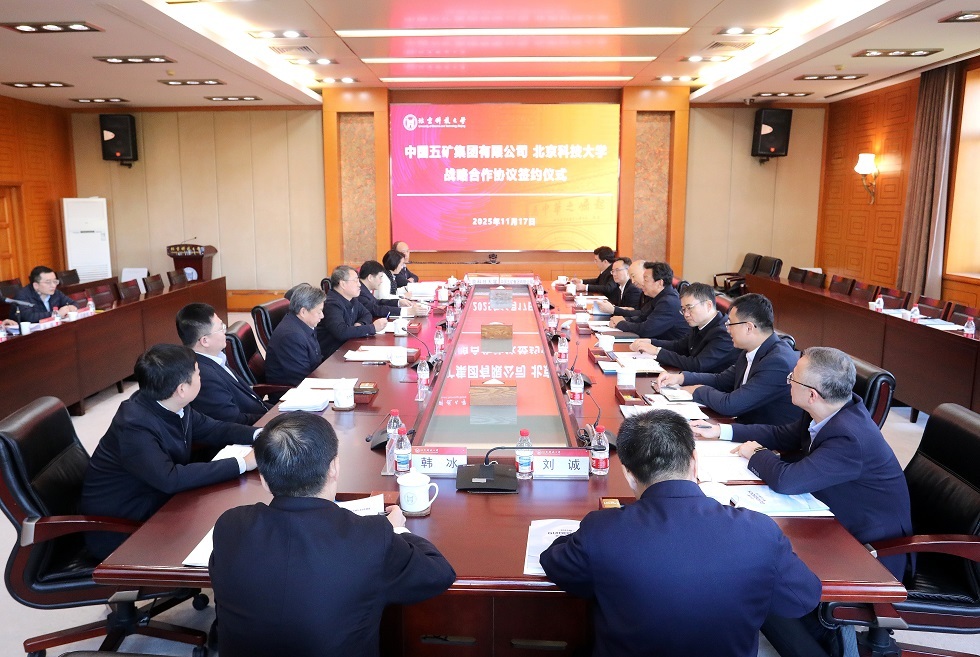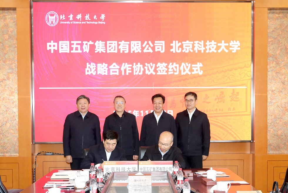 11月17日,中国五矿与北京科技大学在京签署战略合作协议。中国五矿党组书记、董事长陈得信,党组副书记、董事、总经理朱可炳与北京科技大学党委书记武贵龙,校长杨仁树共同见证并座谈。中国五矿党组副书记、董事王杰之,北京科技大学党委常委、副校长张卫冬代表双方签约。北京科技大学党委常委、组织部部长盛佳伟出席。